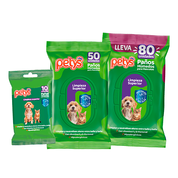 Protegen el pelaje de tu mascota ya que contienen vitamina E, D-Pantenol y Aloe Vera. Cuentan con pH especial para tu mascota y están aprobados por médicos veterinarios. Estos Pañitos Húmedos Petys vienen en tres presentaciones: x10 unidades, ideales para llevar en el bolso, x50 y x80 unidades para tener en casa.